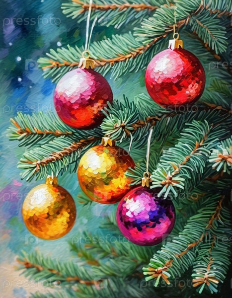 Красочные рождественские украшения украшают ветви ели, яркие шары в красных, золотых и розовых оттенках, олицетворяющие праздничное настроение зимой