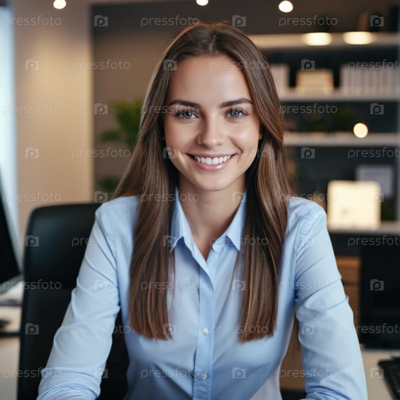 Профессиональная белая женщина в синей рубашке сидит за своим столом в современном офисе, излучая уверенность и позитив. Окружающая среда усиливает ее доступное поведение. Генеративный ИИ