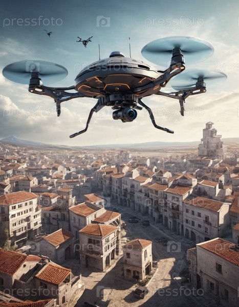 Высокотехнологичный боевой дрон парит над пригородным ландшафтом, делая подробные снимки, наблюдая за местностью в дневное время. Его элегантный дизайн подчеркивает передовые возможности. Генеративный ИИ
