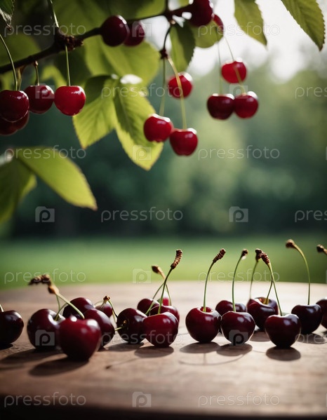 Спелые вишни разложены на деревянном столе под ветвями, полными фруктов, в спокойной обстановке сада, греясь в теплых лучах полуденного солнца, в окружении пышной зелени. Экопродукты. Генеративный ИИ