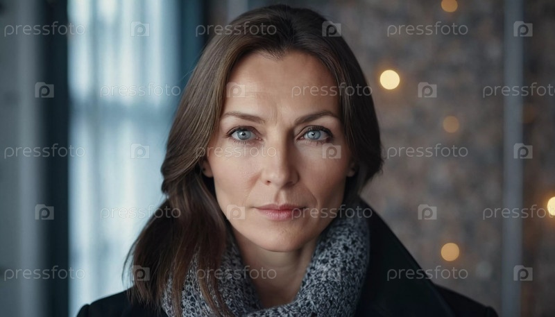 Женщина средних лет, волнистые каштановые волосы, пленительные голубые глаза. Она стоит уверенно, излучая грацию и осанку. Жительница России, женщина 40-50 лет. Портрет обычной женщины. Генеративный ИИ