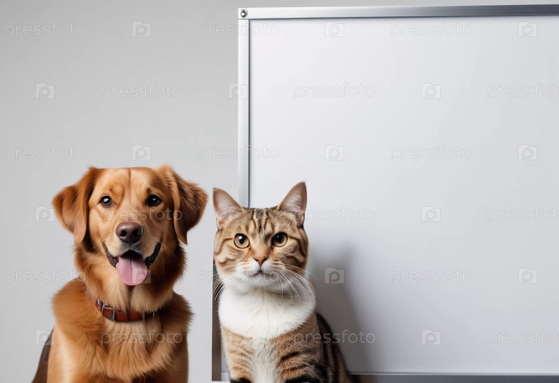 Дружелюбная собака улыбается, сидя рядом с любознательной кошкой в ветеринарной клинике, застывшей у пустой доски объявлений, готовой к предстоящему объявлению или событию