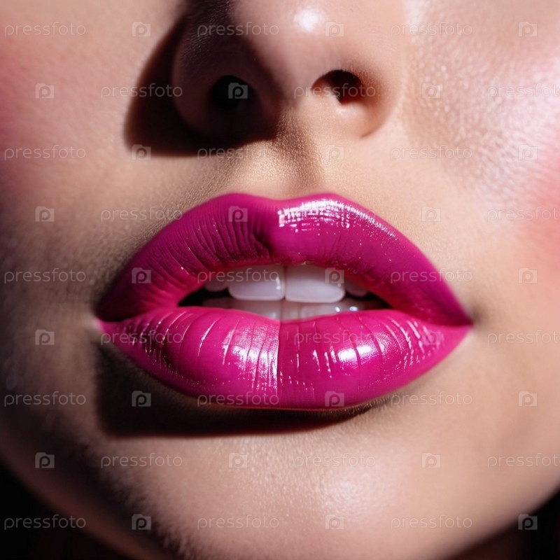 Крупный план женских губ с мерцающей пурпурно-розовой помадой, которая добавляет немного блеска. Губы слегка приоткрыты, открывая вид на белые зубы. Чувственность и сексуальность. Создано с помощью ИИ