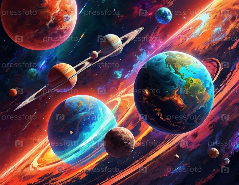 Планетарная система с несколькими планетами, большим ярко окрашенным газовым гигантом и каменистой планетой. Яркие звезды и огромное пространство темного космоса с галактикой на заднем плане. Космические просторы. Космонавтика. ИИ