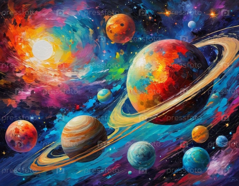 Планетарная система с несколькими планетами, большим ярко окрашенным газовым гигантом и каменистой планетой. Яркие звезды и огромное пространство темного космоса с галактикой на заднем плане. Космические просторы. Космонавтика. ИИ
