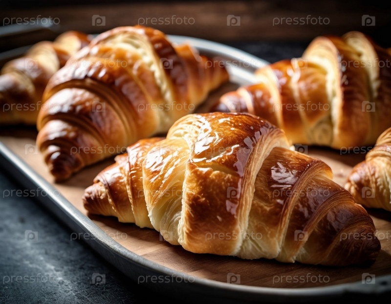 Ассорти из золотисто-коричневых круассанов на деревенском подносе. Теплый ароматный аромат наполняет уютную кухню. Привлекательная витрина предполагает расслабляющую утреннюю встречу, идеальный завтрак-бранч с друзьями семьи