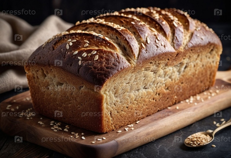 Свежевыпеченный ржаной хлеб лежит на деревянной доске, демонстрируя свою золотисто-коричневую хрупкую корочку, украшенную семьями кунжута.Теплый хлеб прямоугольной формы излучает соблазнительный аромат, который заполняет уютную кухню