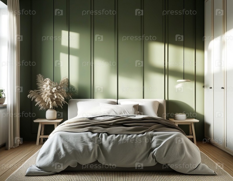 Эта скандинавская спальня демонстрирует удобную кровать с многослойным постельным бельем, стильные растения и минималистский декор, предлагающий умиротворяющую атмосферу. Зеленые стены
