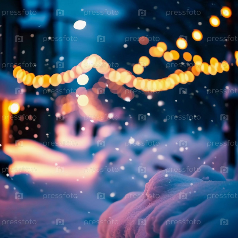 Зима приносит мягкий снегопад на городские улицы, где разноцветные огни висят над головой, создавая теплую и праздничную атмосферу. Эффект боке от огней добавляет причудливый штрих, подчеркивая радость сезона
