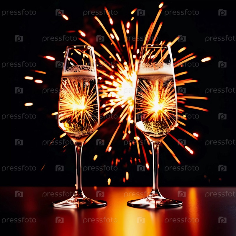 Праздничные бокалы для шампанского на фоне сверкающего фейерверка, приветствующие Новый год во время рождественских празднеств. Генеративный ИИ