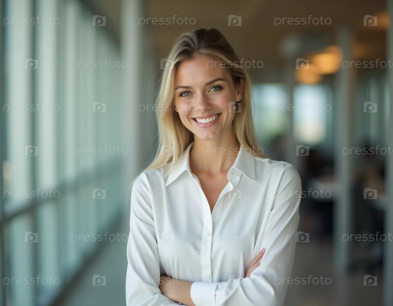 Офис-менеджер, одетая в белоснежную рубашку, излучает уверенность, выполняя свои задачи в стильном и современном рабочем пространстве, наполненном естественным светом. Банковский, страховой, консалтинговый персонал