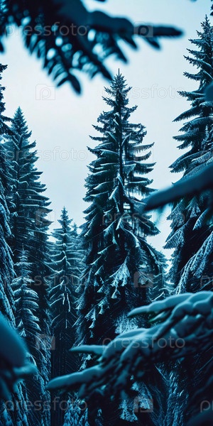 Безмятежный еловый лес, покрытый зимним снегом, демонстрирующий покрытые инеем деревья и мягкий снегопад, создающий спокойную атмосферу в мирной лесной обстановке. Генеративный ИИ