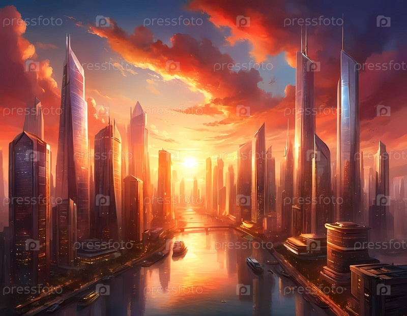 Захватывающий закат бросает теплый отблеск на возвышающиеся небоскребы в оживленном мегаполисе, создавая потрясающий контраст с красочным небом. Энергичная атмосфера городской жизни. Генеративный ИИ