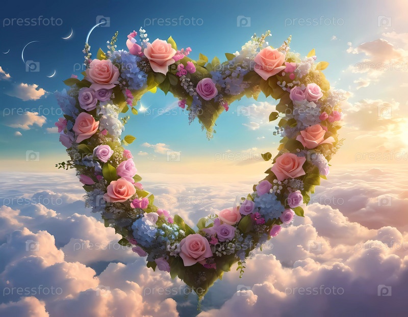Красивая композиция в форме сердца из красочных цветов парит в небе, окруженная мягкими облаками, когда солнце встает, создавая мирную и романтическую атмосферу. Генеративный ИИ. Печаль