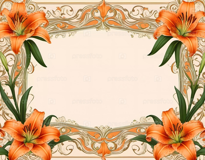 Этот дизайн демонстрирует замысловато украшенную границу с яркими оранжевыми лилиями. Цветочная композиция дополняет элегантную детализацию, делая ее идеальной для приглашений или сезонных поздравлений. Генеративный ИИ