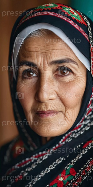 Зрелая 75-летняя таджикская женщина смотрит прямо, демонстрируя сложную традиционную одежду, богатое культурное наследие своей национальности, пробуждая мудрость и изящество