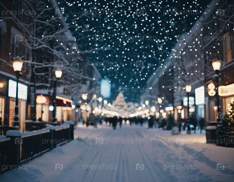 Тихий зимний вечер окутывает городскую улицу, где мягко падающий снег усиливает свечение рождественских огней. Праздничная атмосфера привлекает людей, празднующих Новый год. Генеративный ИИ