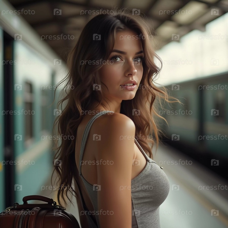 Девушка с волнистыми волосами стоит на вокзале, поворачиваясь, чтобы посмотреть в камеру, держа чемодан. Путешественники суетятся мимо нее, пока она ждет свой поезд. Красивая молодая женщина. Генеративный ИИ