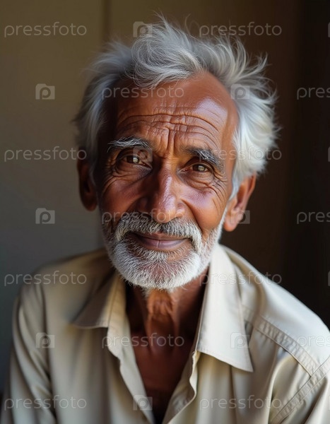Пожилой мужчина из Индии излучает радость с теплой улыбкой и мерцающими глазами. Его седые волосы и борода отражают мудрость его лет, демонстрируя жизнь, богатую опытом. Генеративный ИИ
