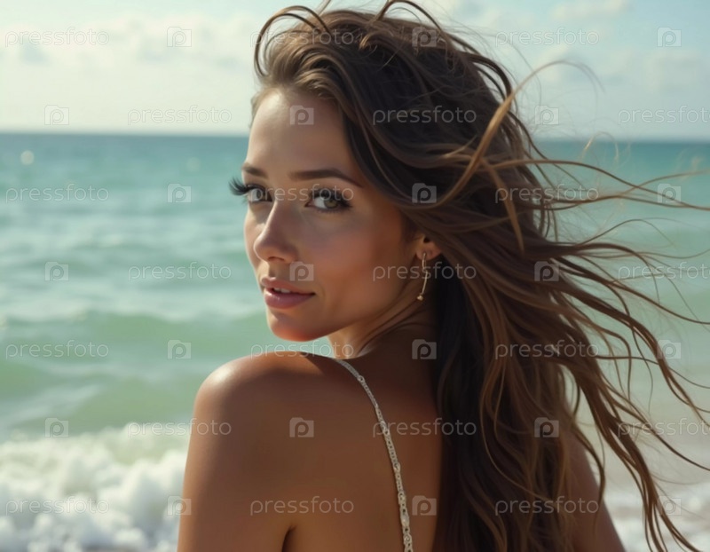 Брюнетка в купальнике оглядывается назад, стоя у береговой линии. Нежные морские волны пляшут у ее ног под ясно голубым небом. Длинные волосы, красивое молодое лицо. Реклама путешествий и одежды. AI