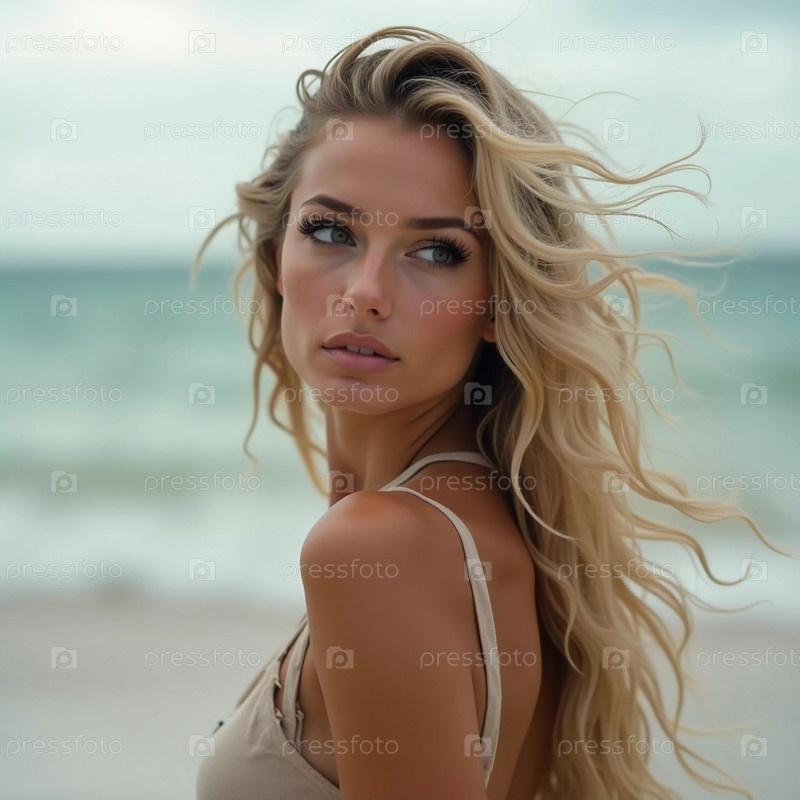 Блондинка в купальнике оглядывается назад, стоя у береговой линии. Нежные морские волны пляшут у ее ног под ясно-синим небом. Длинные волосы, красивое молодое лицо. Реклама путешествий и одежды. AI