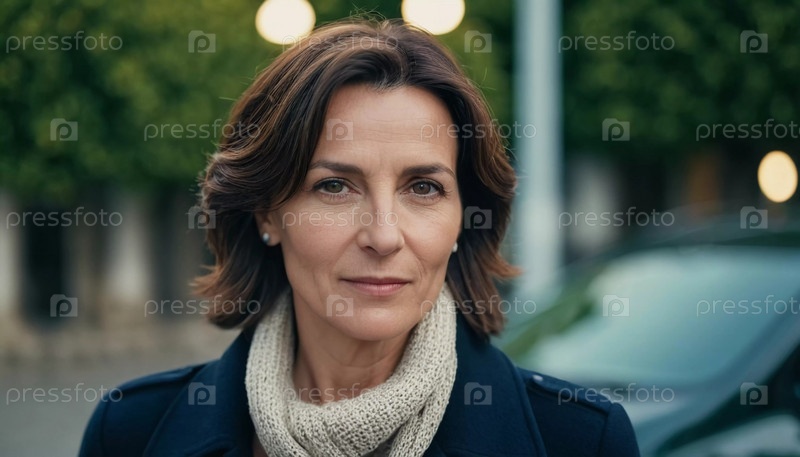 Француженка-брюнетка 60 лет с волосами средней длины и безмятежным выражением лица идет по красиво ухоженной дорожке, обсаженной деревьями. Генеративный ИИ