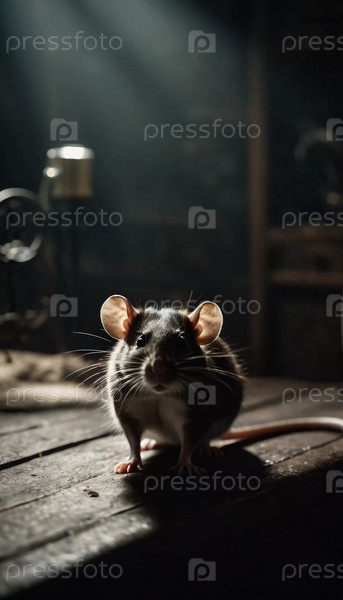 Маленькая крыса перемещается по темному пространству, освещенному мерцающей лампой. Усы дергаются, когда она исследует окрестности в поздние часы. Страшная атмосфера вампира или Хэллоуина. Генеративный ИИ