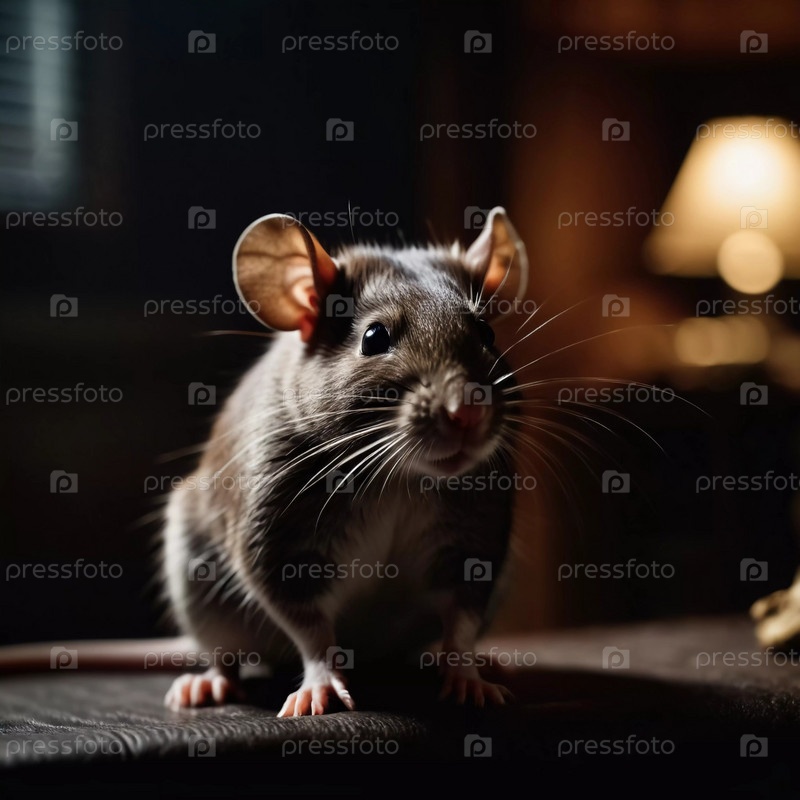 Маленькая крыса перемещается по темному пространству, освещенному мерцающей лампой. Усы дергаются, когда она исследует окрестности в поздние часы. Страшная атмосфера вампира или Хэллоуина. Генеративный ИИ