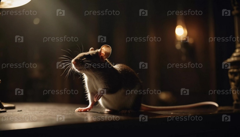 Маленькая крыса перемещается по темному пространству, освещенному мерцающей лампой. Усы дергаются, когда она исследует окрестности в поздние часы. Страшная атмосфера вампира или Хэллоуина. Генеративный ИИ