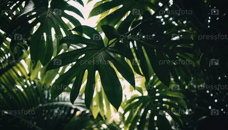 Яркие листья монстеры грациозно свисают, купаясь в мягком солнечном свете, проникающем сквозь полог тропического леса, создавая безмятежную атмосферу. Генеративный ИИ