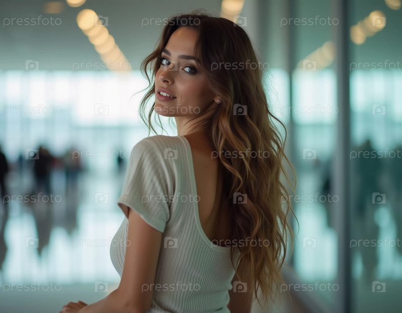 Стильная брюнетка стоит в аэропорту, держа чемодан и оглядываясь назад с уверенным выражением лица. Путешественники суетятся вокруг нее, пока она ждет, одетая в повседневную облегающую одежду. Генеративный ИИ