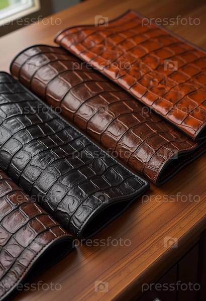 Различные образцы натуральной крокодиловой кожи представлены в ярких цветах. Каждый экземпляр демонстрирует уникальные текстуры и отделки, привлекательные для любителей кожи и дизайнеров. Генеративный ИИ