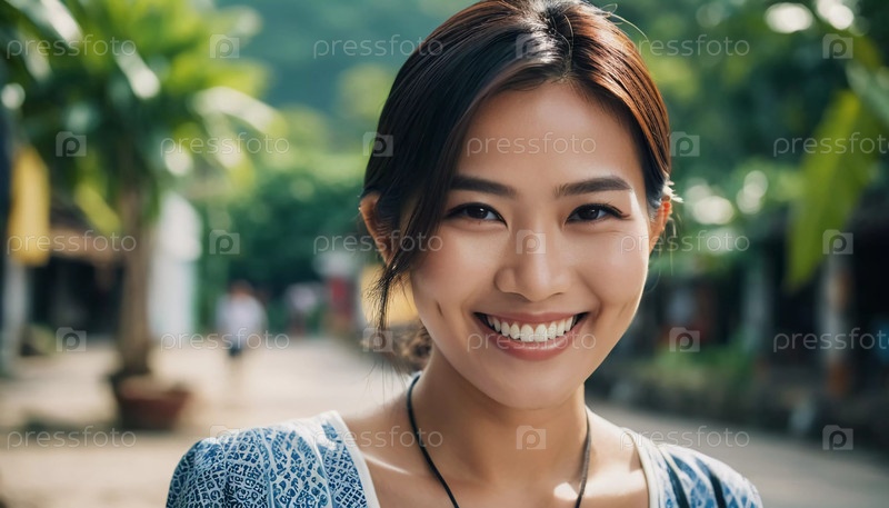 Женщина в Таиланде широко улыбается, стоя в своем районе. Яркая зелень вокруг нее дополняет радостную атмосферу солнечного дня, отражая ее жизнерадостный дух. Генеративный ИИ
