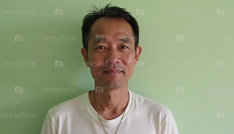 Мужчина из Таиланда уверенно стоит на простом зеленом фоне, одетый в простую футболку и демонстрирующий спокойное поведение. Его улыбка отражает чувство легкости и тепла. Генеративный ИИ