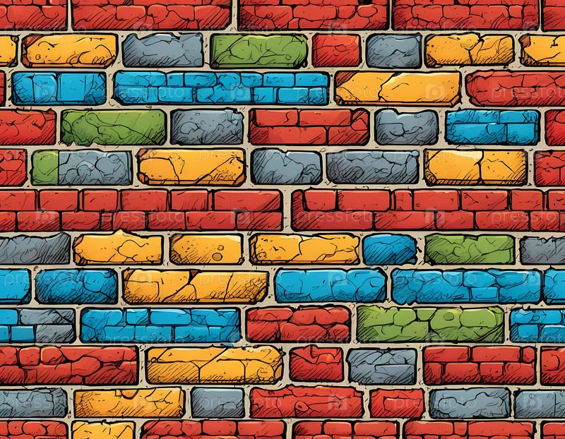 Эта яркая кирпичная стена демонстрирует множество цветов, включая красный, желтый, бирюзовый и фиолетовый. Дизайн отражает художественный подход, часто встречающийся в городской среде. Генеративный ИИ