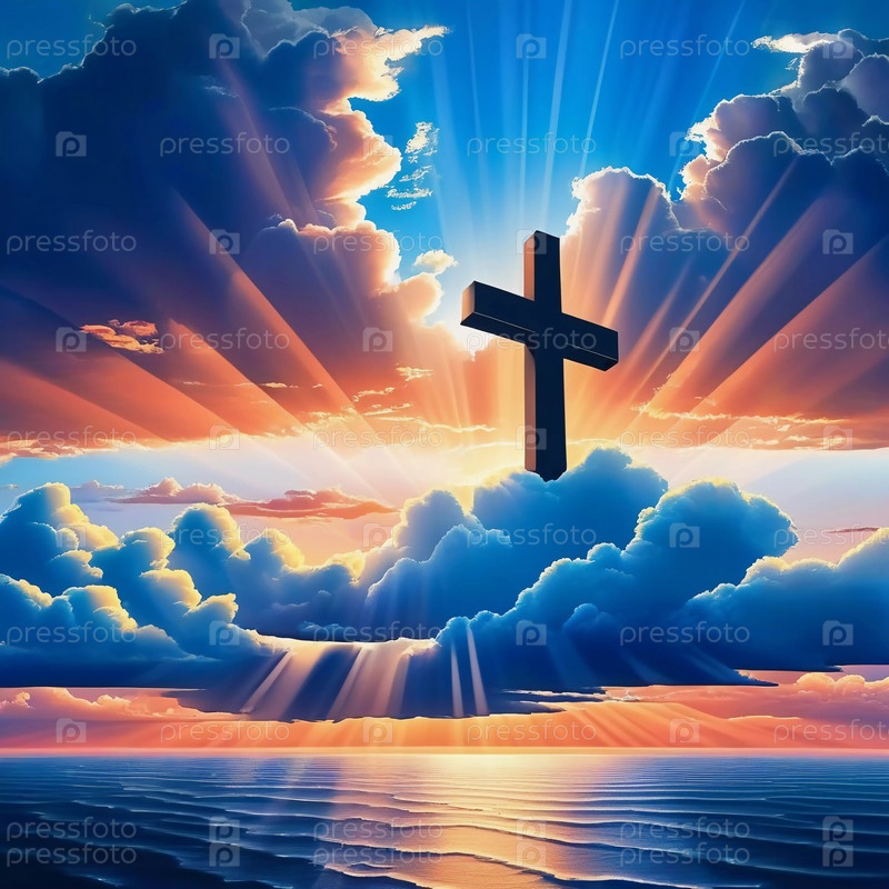 Прекрасный восход солнца прорывается сквозь облака, сияющие лучи света вокруг черного креста. Небо окрашено в цвета рассвета, создавая безмятежную и воодушевляющую атмосферу. Генеративный ИИ