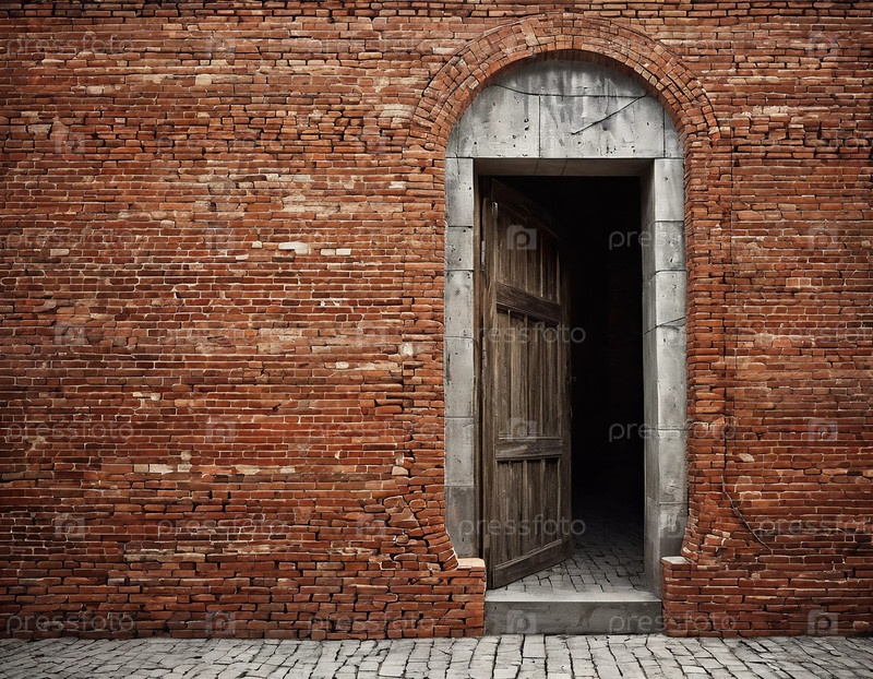 Сплошная кирпичная стена открывает элегантный арочный вход, открывающий деревенскую деревянную дверь, которая приоткрыта, вызывая любопытство к пространству за ней. Генеративный ИИ