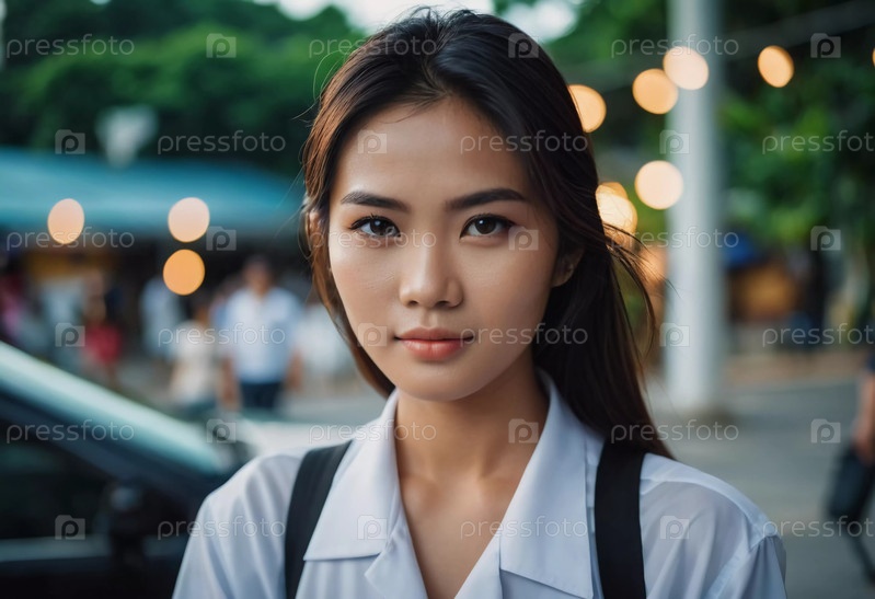Молодая женщина уверенно стоит на открытом рынке в Таиланде вечером. Теплый свет создает оживленную атмосферу, пока люди просматривают близлежащие прилавки