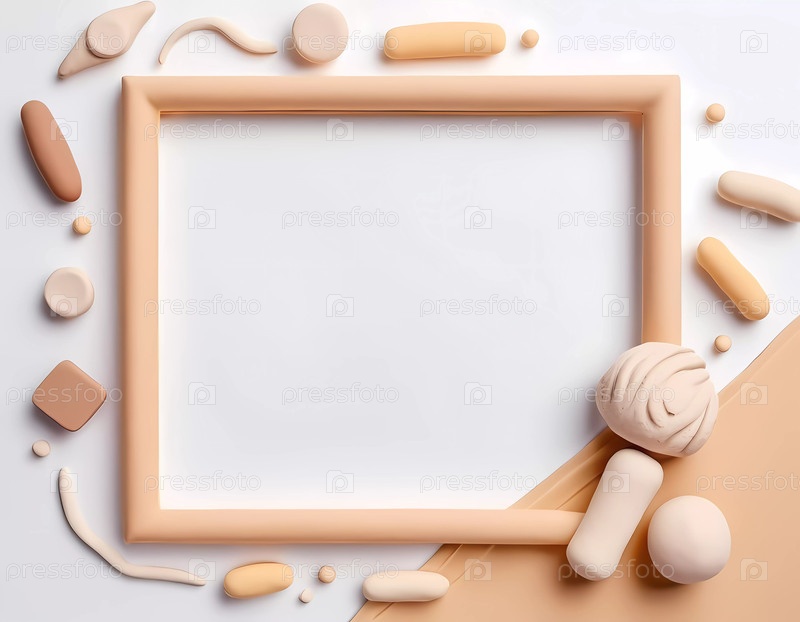 Различные фигурки из пластилина белого и бежевого цветов окружают пустую рамку, побуждая к творчеству и художественному поиску в структурированной обстановке