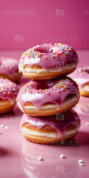 Очаровательные пончики с розовой клубничной глазурью выставлены на деревенском деревянном фоне. Посыпка и украшения из конфет добавляют яркие цвета, создавая праздничное угощение. Генеративный ИИ