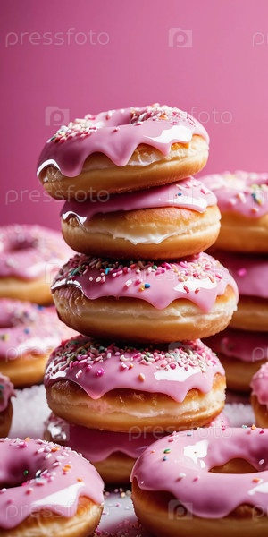 Очаровательные пончики с розовой клубничной глазурью выставлены на деревенском деревянном фоне. Посыпка и украшения из конфет добавляют яркие цвета, создавая праздничное угощение. Генеративный ИИ