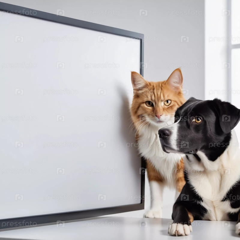 В современной ветеринарной клинике любопытный кот и внимательная собака стоят рядом с пустой вывеской, ожидая предстоящего осмотра у ветеринара. Ветеринария, продажа товаров для животных. ИИ