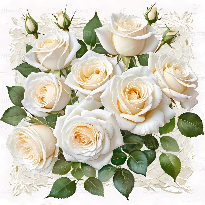 Потрясающая композиция из белых роз разного размера, подчеркнутая свежими зелеными листьями. Этот букет добавит очарования и элегантности любой обстановке, идеально подходит для празднования особых моментов. Генеративный ИИ