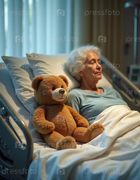 Пожилая женщина тихо размышляет в больничной палате, рядом с ней ее верный плюшевый мишка, символизирующий тепло и стойкость в трудный период выздоровления и одиночества