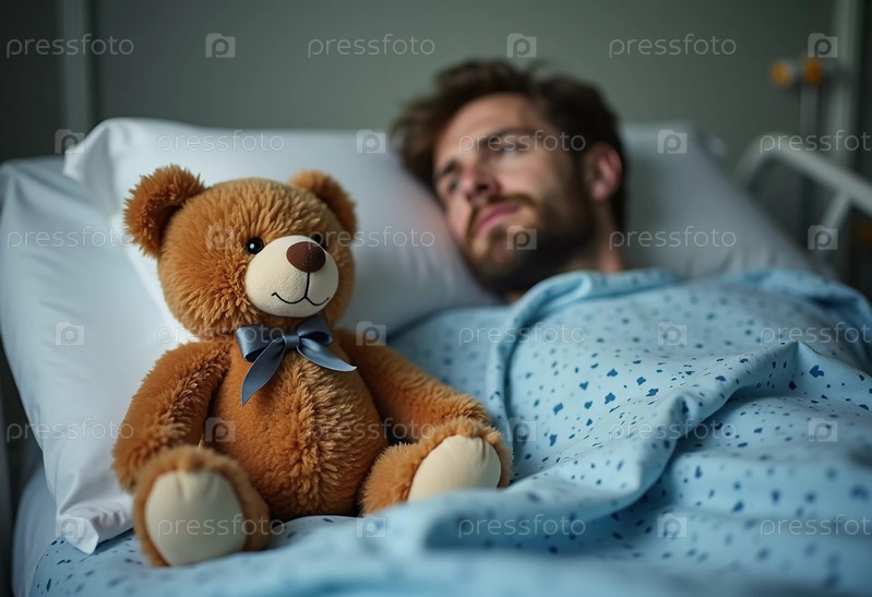 Больной мужчина отдыхает на больничной койке, глядя на мягкого плюшевого мишку рядом с собой. Плюшевый компаньон символизирует надежду и утешение во время его пути к выздоровлению