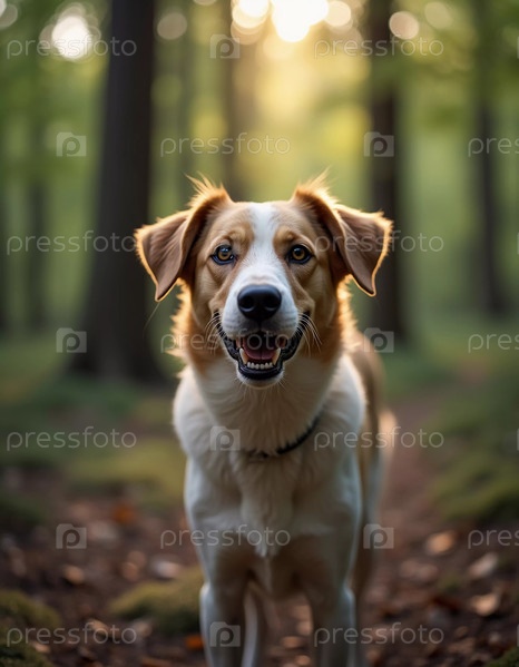 Веселая собака стоит на тихой лесной тропе, окруженной высокими деревьями.Солнечный свет проникает сквозь листья, отбрасывая теплый блеск на ее веселое выражение лица AI