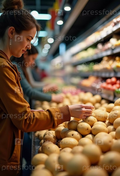Женщина тщательно выбирает картофель с хорошо укомплектованной полки супермаркета, окруженной красочными продуктами. Атмосфера оживленная, так как покупатели просматривают товары поблизости