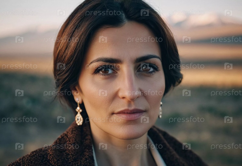 Армянка с яркими чертами лица стоит на фоне пленительных пейзажей своей родины, излучая элегантность и силу на золотом фоне природного ландшафта. Генеративный ИИ