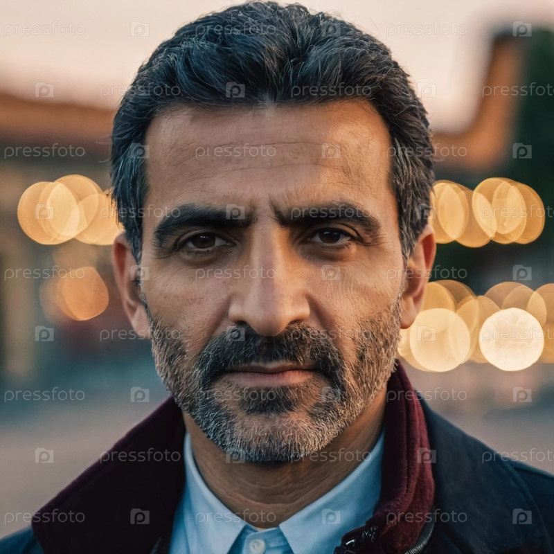 Армянский мужчина средних лет стоит уверенно, его пристальный взгляд улавливает очарование оживленной улицы, наполненной яркими огнями и яркой атмосферой в сумерках