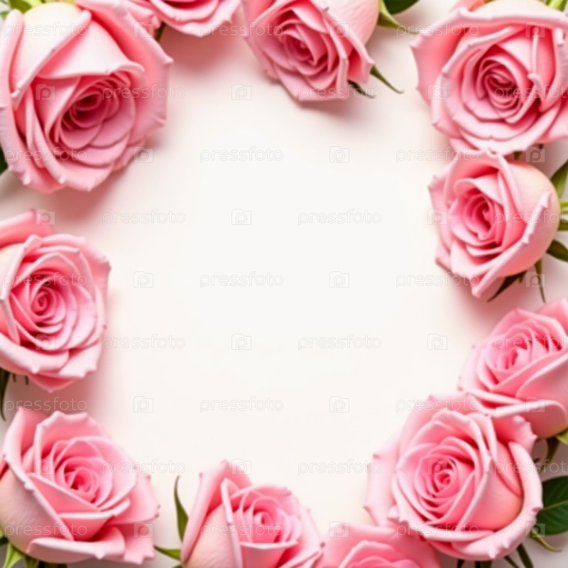 Окруженный кругом пышных розовых роз, мягкий белый фон подчеркивает красоту каждого цветка, создавая спокойную и элегантную атмосферу, идеальную для праздников. Генеративный искусственный интеллект